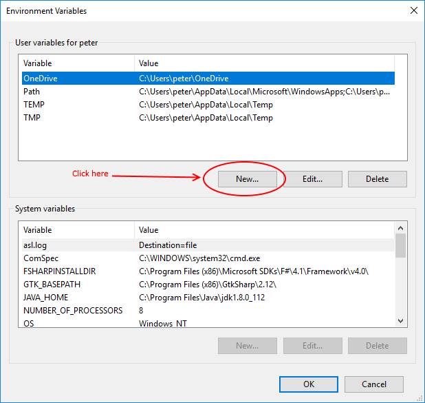 17) In the top box, type JAVA_HOME (use an underscore character between JAVA and HOME)